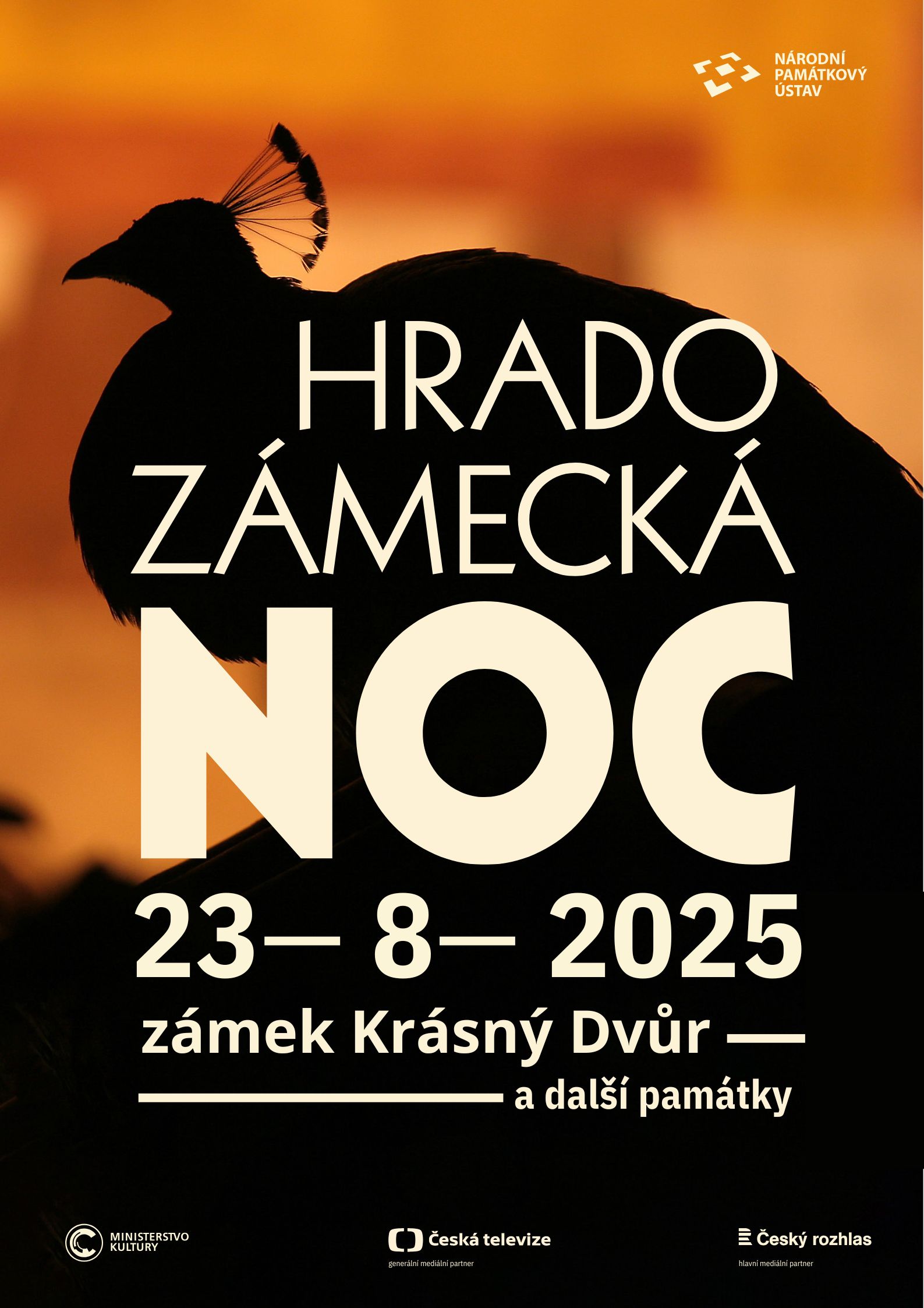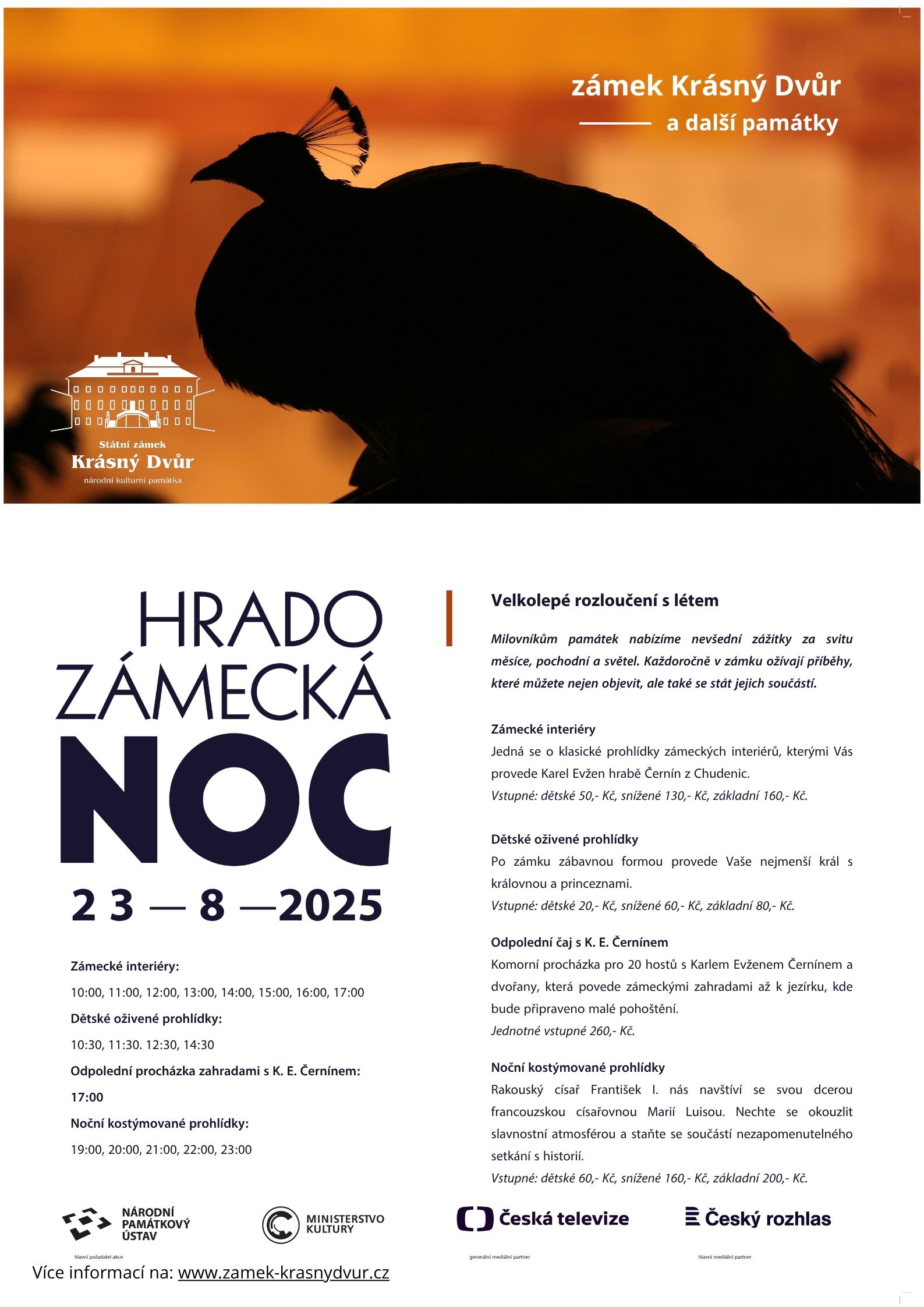 Hradozámecká noc je především noc plná neobvyklých zážitků na krásných místech. Večerní program zahájí v 17.00 hodin komorní procházka pro 20 hostů s Karlem Evženem Černínem a dvořany, která povede zámeckými zahradami až k jezírku. Zde bude podáván přípitek a odpolední svačinka. Od 19.00 hodin do 23.00 se každou celou hodinu budou konat Kostýmované prohlídky, tentokrát na téma pobytu císaře Františka I Rakouského s dcerou Marií Luisou na zámku Krásný Dvůr v roce 1812. Nenechte si ujít tento výjimečný „návrat“ do historie a kouzelnou atmosféru po setmění.